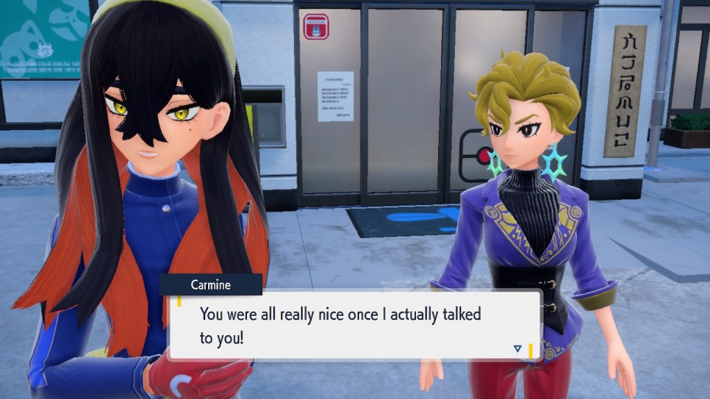 Then there’s the epilogue thing. It’s where you catch the special event pokemon, pecha kucha. That’s not actually what it’s called but I don’t really care at this point. The fun part was that it brought the main Paldea gang to Kitikami. It’s fun seeing these characters get a chance to interact for the first time. Probably won’t happen again. Great. I liked the resolution to Kieran’s story. He learned to accept that battles are fun whether you win or lose again thanks to Nemona. He was an MVP helping you out against the mochi invasion. Afterwards he decides to rejoin school and get back into things with a fresh perspective. Carmine stayed with him during his leave of absence and happily joins him on the return. They stick together. By the way, they did Carmine dirty in that epilogue. Why the hell did she have to be mochi’d up from the start? She barely got any real lines until the end. What a fucking waste!