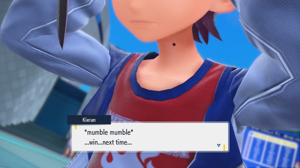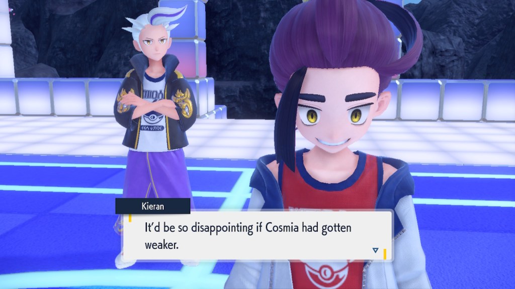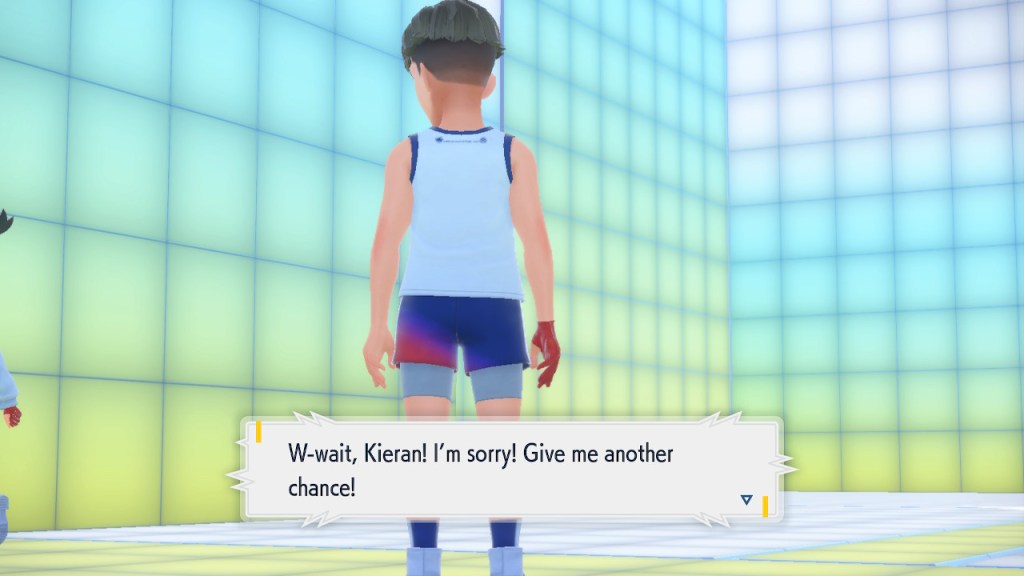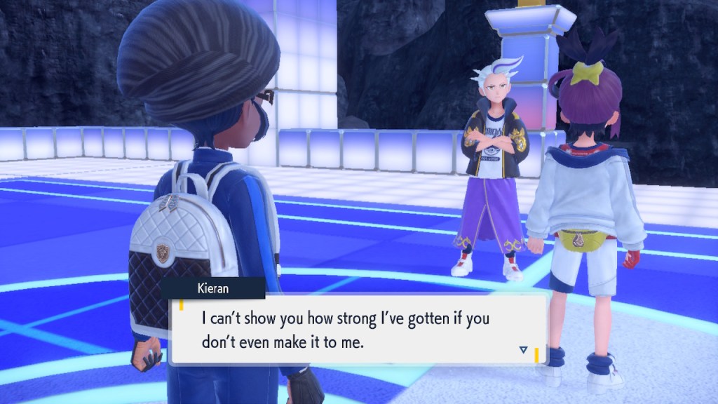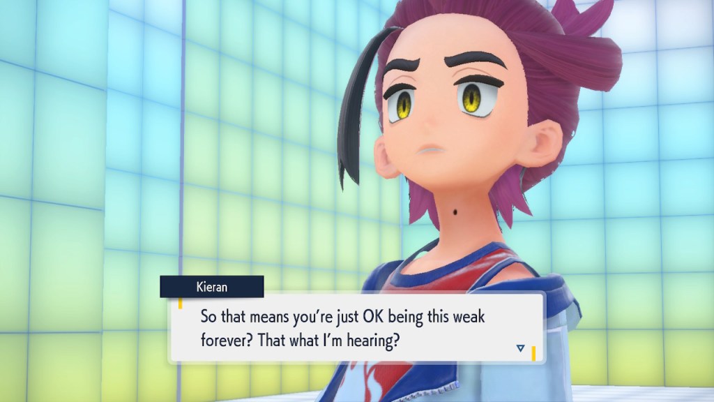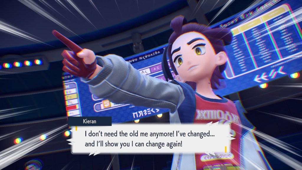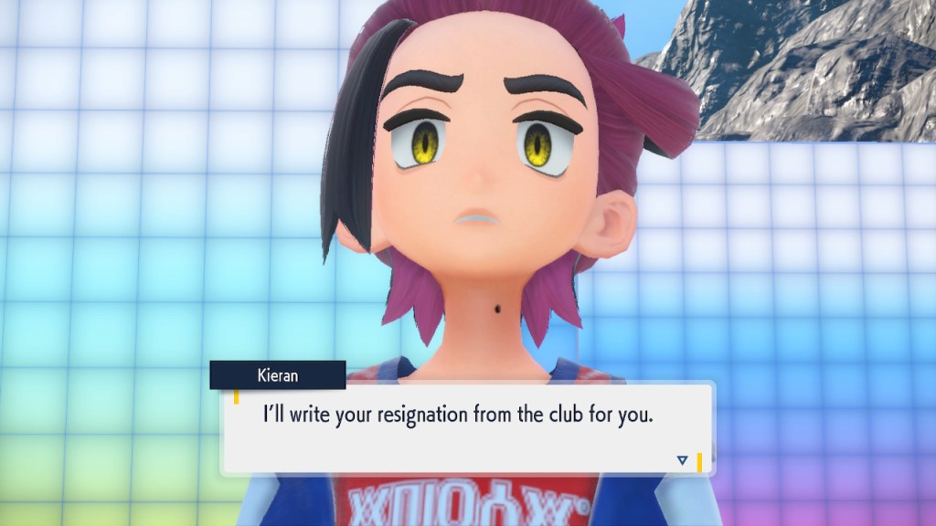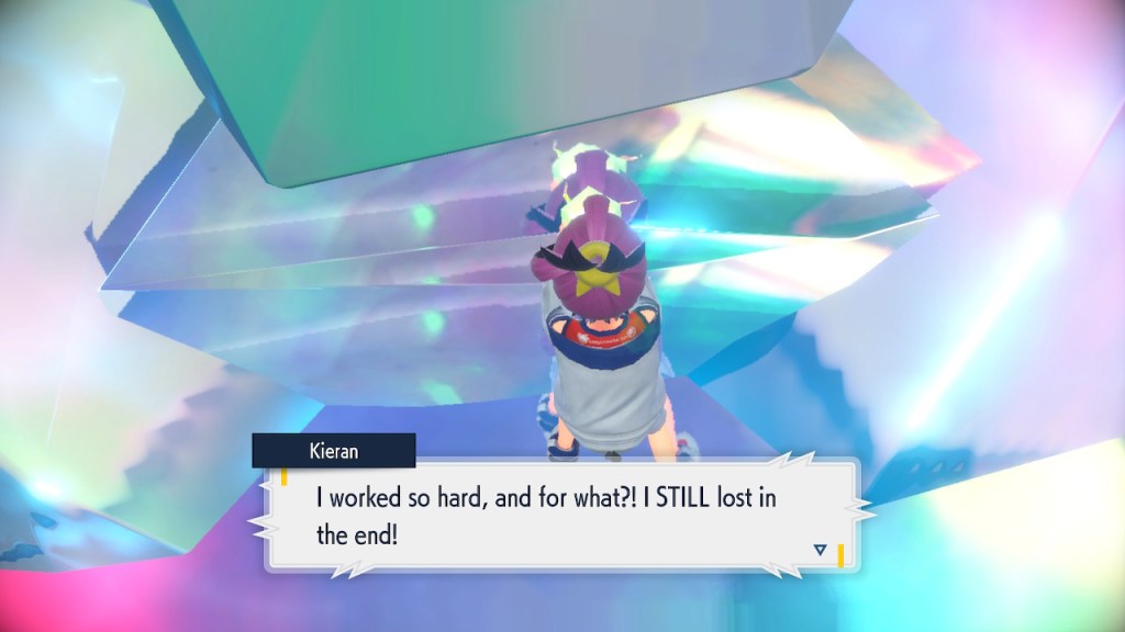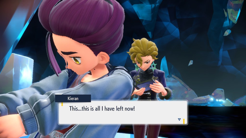 So what’s going on with Kieran? Well, he’s bothered by multiple things. He’s not happy about Carmine and the player character hiding what they learned about Ogerpon from him. He’s bothered by the Ls the player character keeps handing him in battle. He’s frustrated by his own perceived weakness. And when Ogerpon, someone he felt some sort of parasocial bond to, goes with the player character instead he has a hard time handling it. Honestly I was tempted to just let him have Ogerpon, not like I was planning on using it. Alas, the game doesn’t give you that option. So he continues to spiral. His initial admiration for the player character morphs into an envious obsession with getting one over on you.