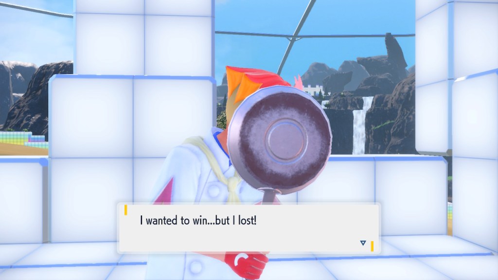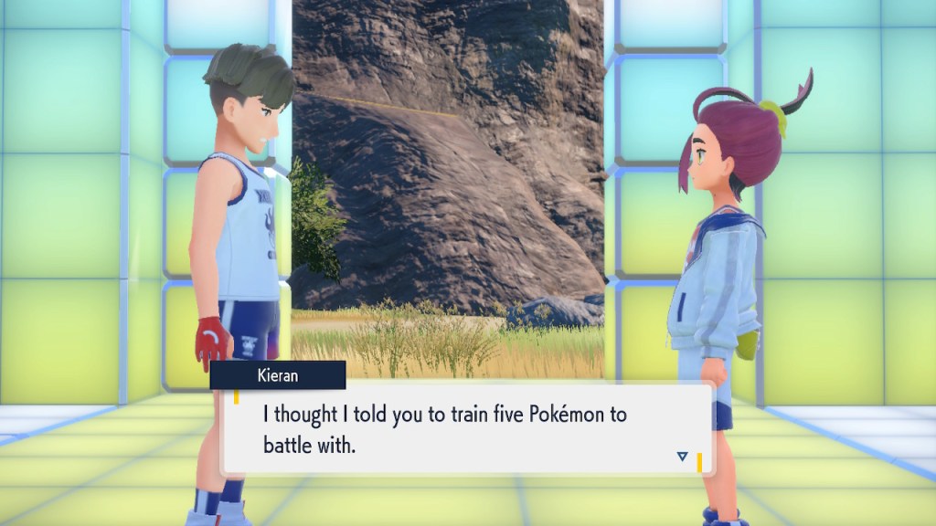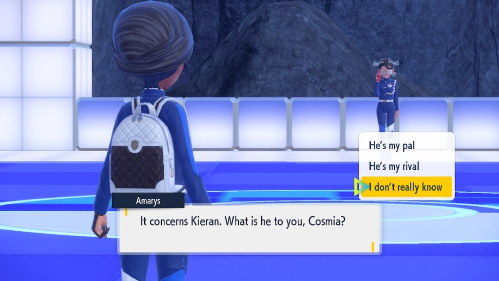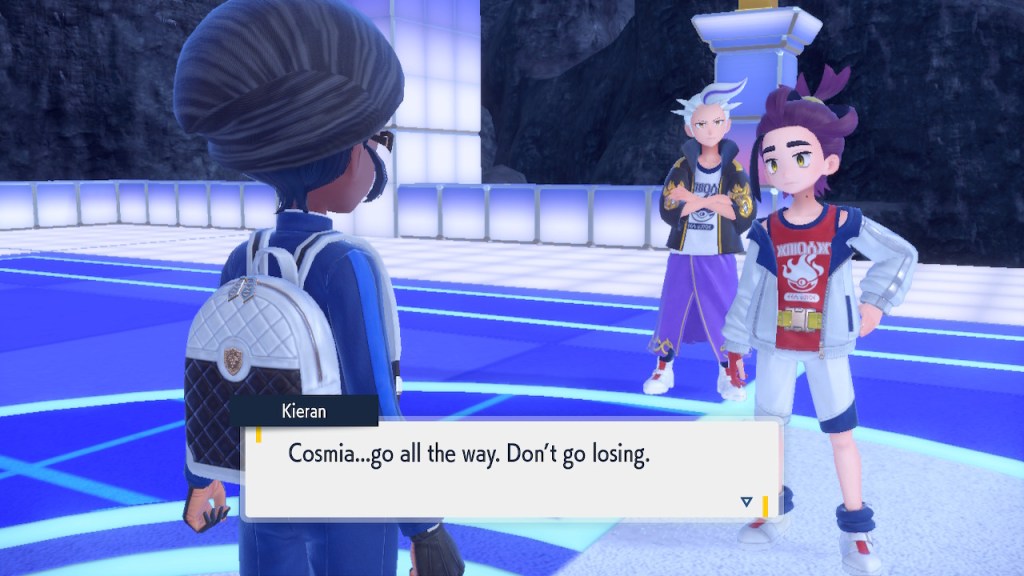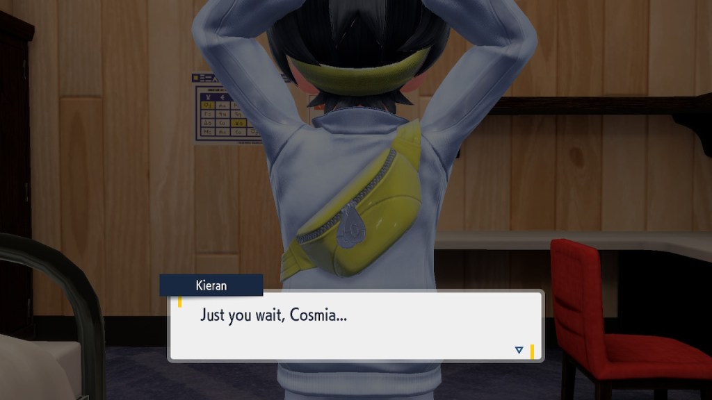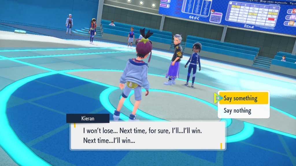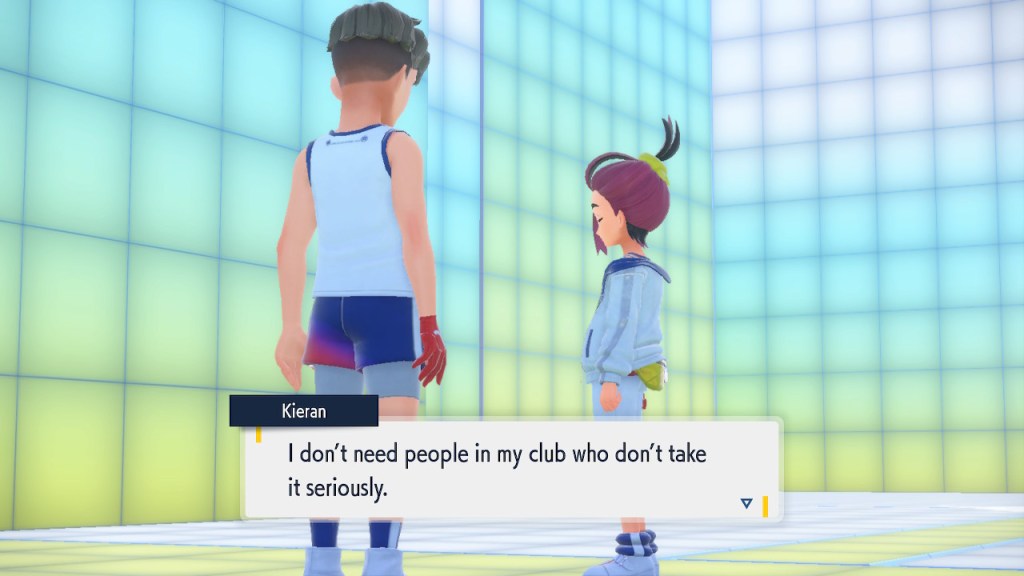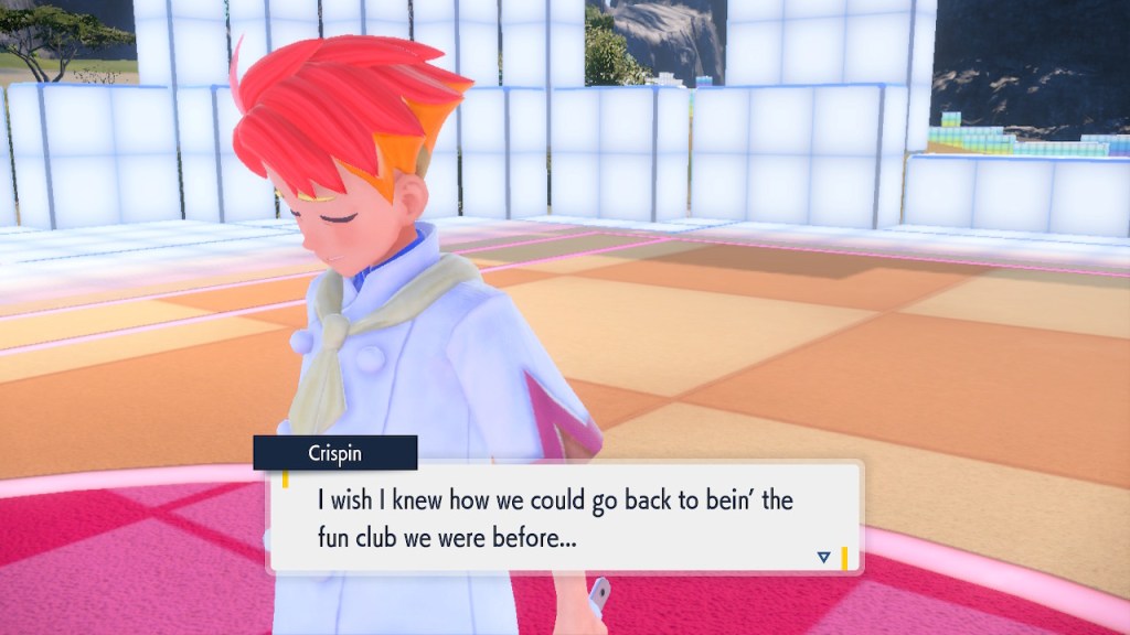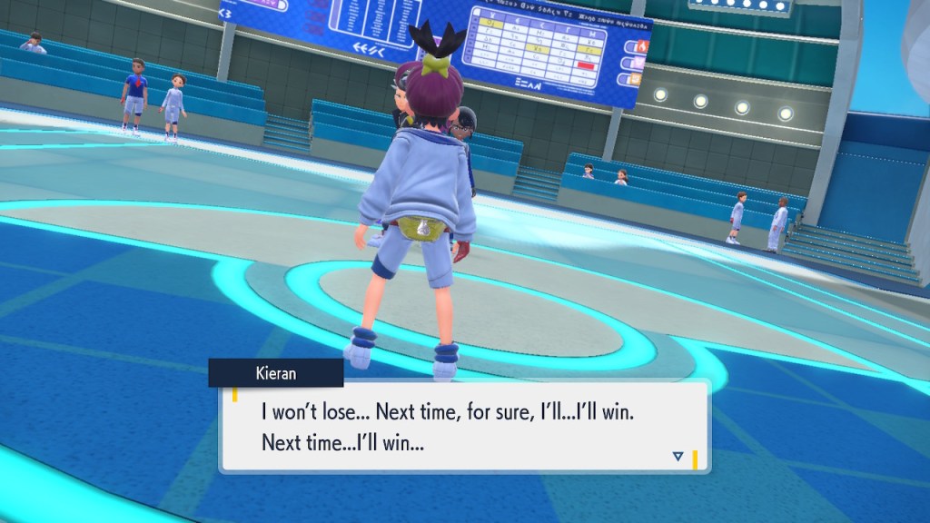 So what’s going on with Kieran? Well, he’s bothered by multiple things. He’s not happy about Carmine and the player character hiding what they learned about Ogerpon from him. He’s bothered by the Ls the player character keeps handing him in battle. He’s frustrated by his own perceived weakness. And when Ogerpon, someone he felt some sort of parasocial bond to, goes with the player character instead he has a hard time handling it. Honestly I was tempted to just let him have Ogerpon, not like I was planning on using it. Alas, the game doesn’t give you that option. So he continues to spiral. His initial admiration for the player character morphs into an envious obsession with getting one over on you.