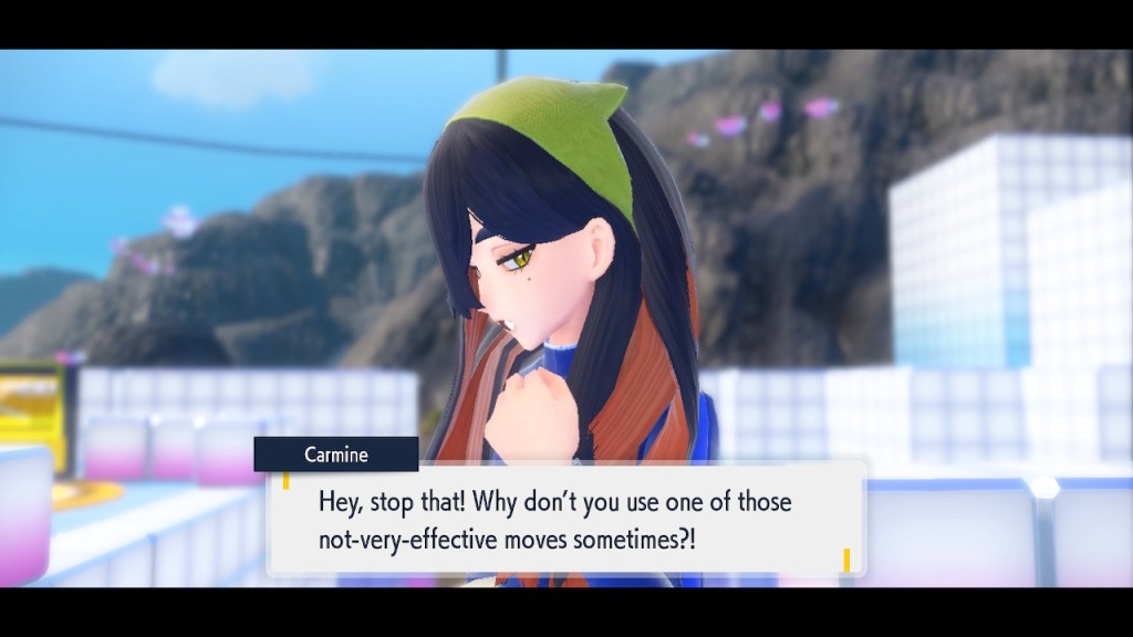 So Carmine’s back. She said we’d see each other again and we did. I’m a sucker after all. We get another battle with her for the hell of it, which is fine. Carmine’s not exactly the toughest opponent. She can do some damage but she’s not a premiere threat. Instead she’s premiere at saying goofy lines in the middle of battle. By the way, the whole things where major trainers drop lines in the middle of battle is a great touch. I feel like the older games would have benefited from that too. Gives the characters a chance to show more personality, and makes it feel more like a Pokemon battle from the anime.
