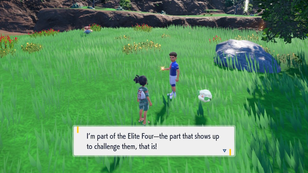 Any ways. According to school rules visiting students aren’t really supposed to participate in the Elite Four challenge. Thanks to the Elite Four guys being loose with the rules we manage to get in any way. The Elite Four members are divided one per biome, and you can take them on in any order you want. They’re not quite like the Paldea Elite Four. They’re kind of like a gym leader/Elite Four hybrid. You have to clear some sort of challenge before the final battle. Guess it doesn’t make much sense to take on the Elite Four if you can’t even handle their grunts.