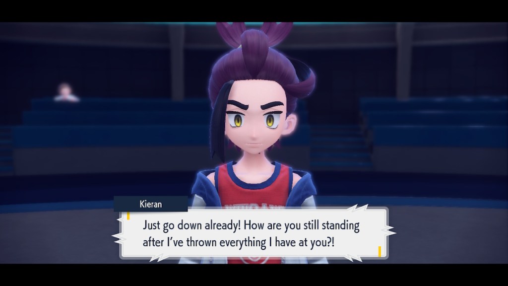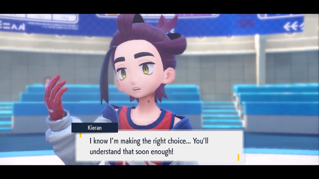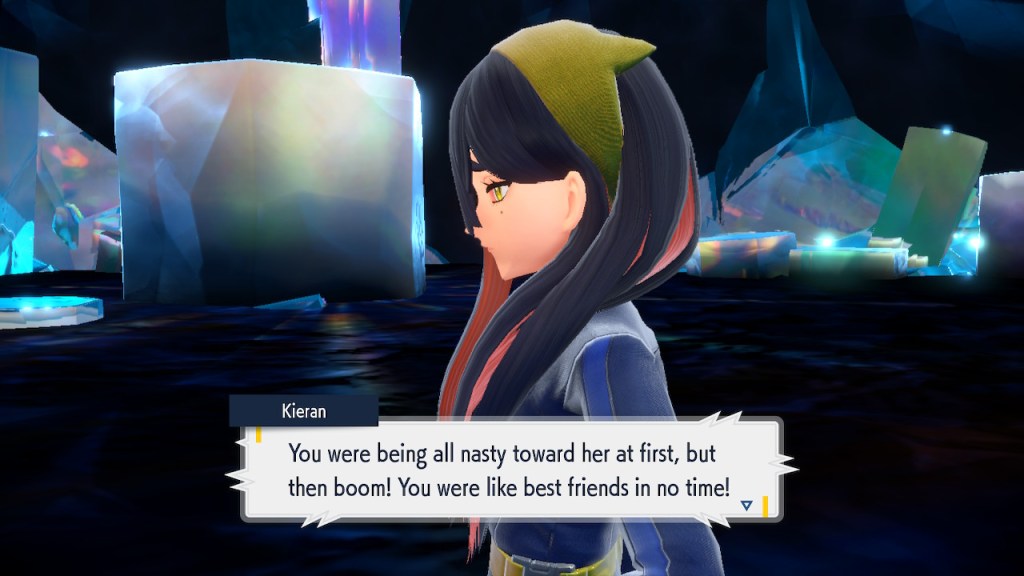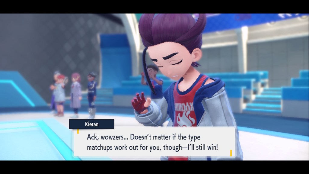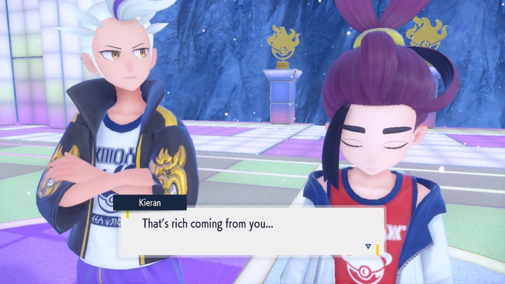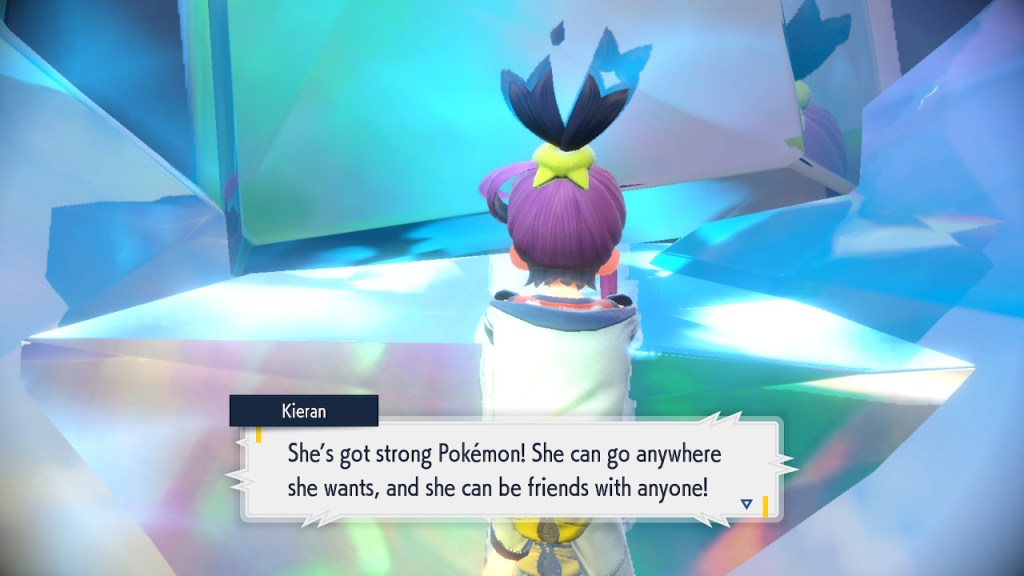 Kieran’s development over Teal Mask is interesting to me. Seeing any character development at all used to be a rarity in the Pokemon world. Seeing character development that goes off in a negative direction even more so. Usually NPCs aren’t that bothered by losing to the player character. They can get frustrated but they somehow seem to instinctively know they’re just another step on the player’s journey. But Kieran isn’t satisfied with that role. For some people that might make them like him less. For me, it makes me like him more. He’s bringing something unique to the table, something I haven’t seen before in a Pokemon game and don’t see much of outside of it either.