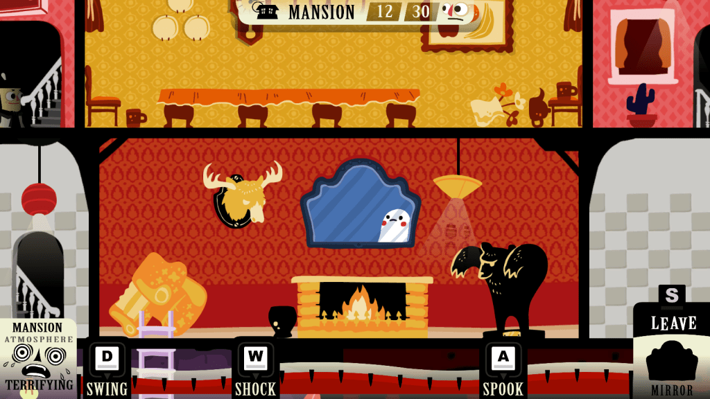 That large paragraph I just wrote can be simplified even further, “You’re a ghost, people are in your house, scare them away”. That’s all there is, there’s no incredibly difficult bosses to fight, no time travel shenanigans with giant robots, no washed up detectives (though SFB DID make a detective game, but he doesn’t appear in this one) it’s just you, your house and the things in it. You’re not give much backstory on who the ghost was or how he died, but given that the chest in his room (why does a ghost need a room?) has an action where a skeleton pops out, one can draw their own conclusion. He’s got a ruffle around his nonexistent neck that reminds me of a clown, so perhaps he was one?