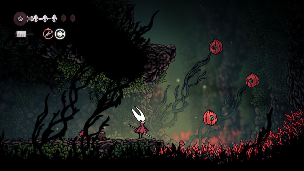 The ants go marching two by two hurrah, hurrah. This is the area that leads up to the beast, and it’s a beast in its own right. It’s a woodsy setting full of green and red, the brutal undercurrent of the forest. Our protagonist Hornet who isn’t exactly a hornet is marching right into ant territory. Even as a rather large human I would be nervous about fucking with ants too much. It depends on the species but some types can mob your ass and kill you if you’re unprepared. Even the less lethal ones can certainly give you an unpleasant time. But if ants were our size? Yeah that would be a problem for us. And so they are in this game. Or is it that we’re all bug sized? But there’s regular small ants in this area alongside the big ants that fight. So I guess we’re larger than usual insects but not quite human sized. I still wouldn’t want to fuck with these ants they’d break my legs.