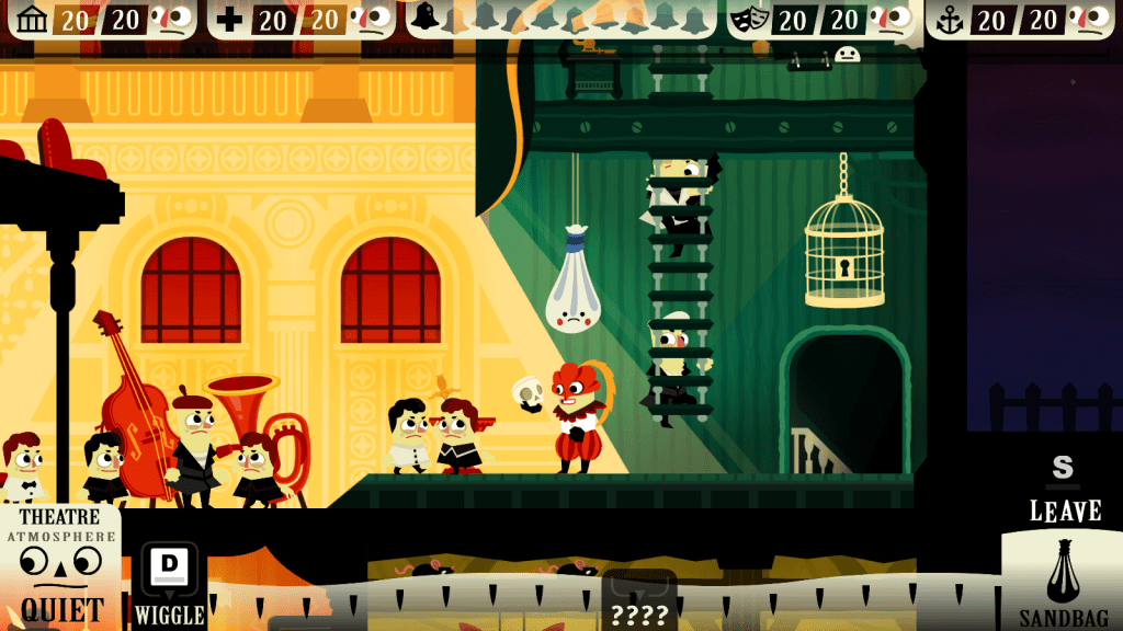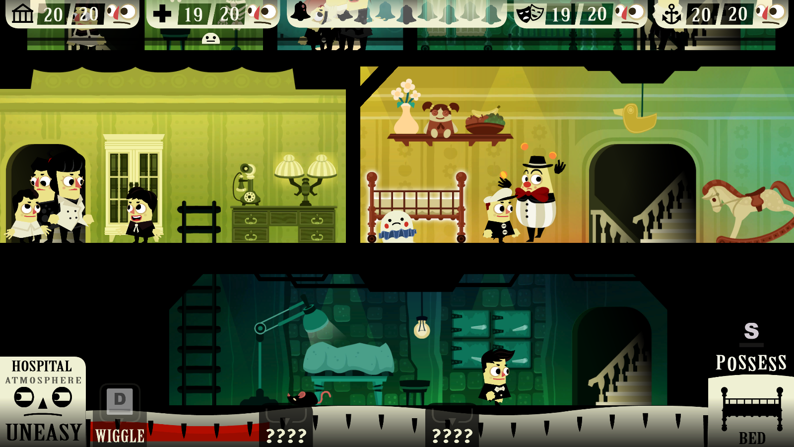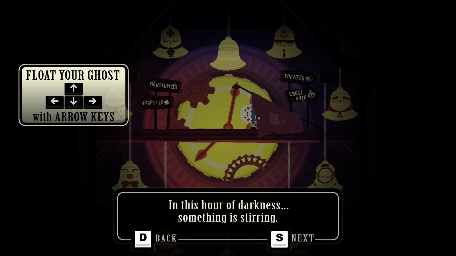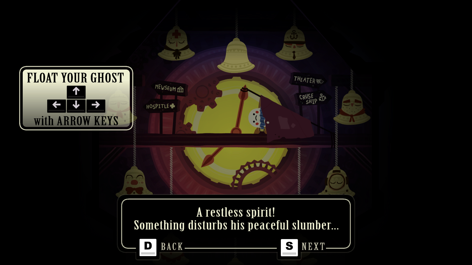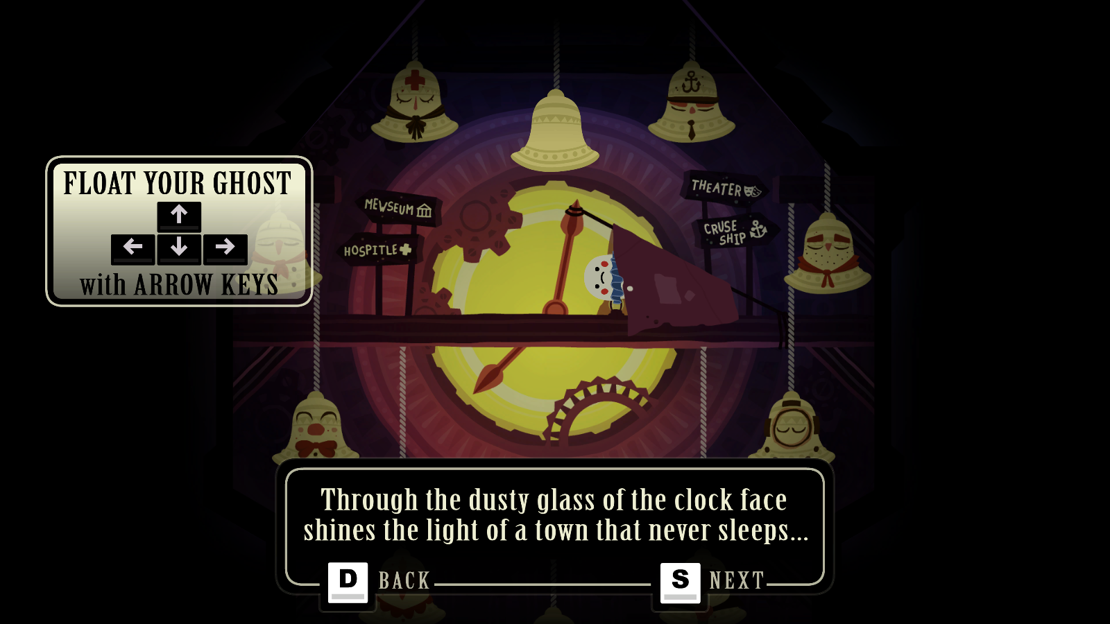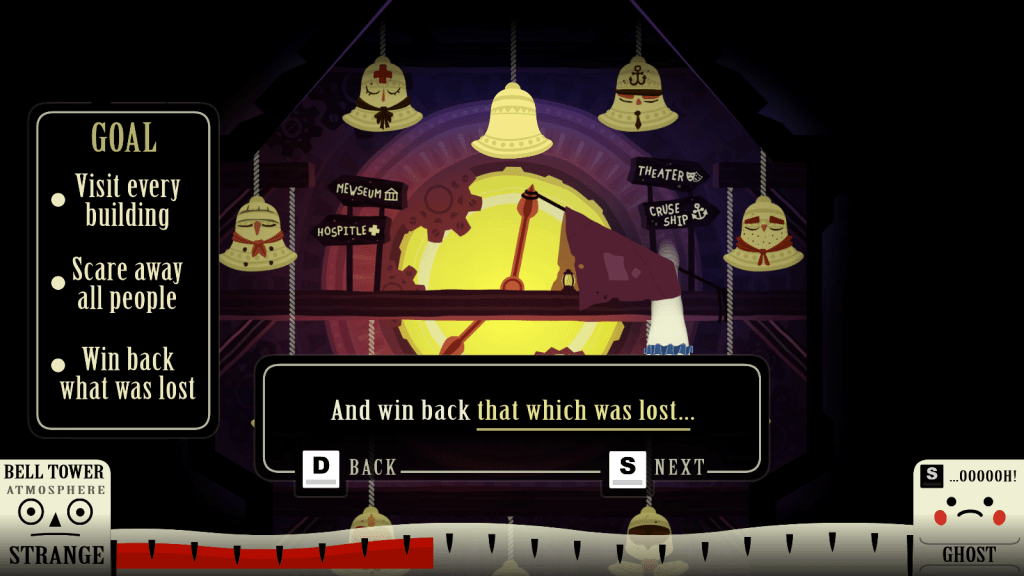 SFB decided to keep things simple for the sequel and didn’t change the core gameplay, which is good because there’s so little to even change. Movement is the same as it was in the first game, arrow keys to move, spacebar to possess. The only difference besides the expanded map is the requirement for each area. The OG HTH had 30 guests that you had to scare away, which would be a lot to ask for four locations. Thankfully each building in the town has twenty people in them, which is much more manageable. One key difference though is that each location holds unique people that you can’t scare away, no matter how frightening you make the atmosphere. These are special characters that you can kill with a certain object you can possess, and doing so sends their spirit to the clock tower. Upon returning there, you can hover over their respective bell to change the skin of the ghost. And because there are multiple people, this endeavor can bring up a