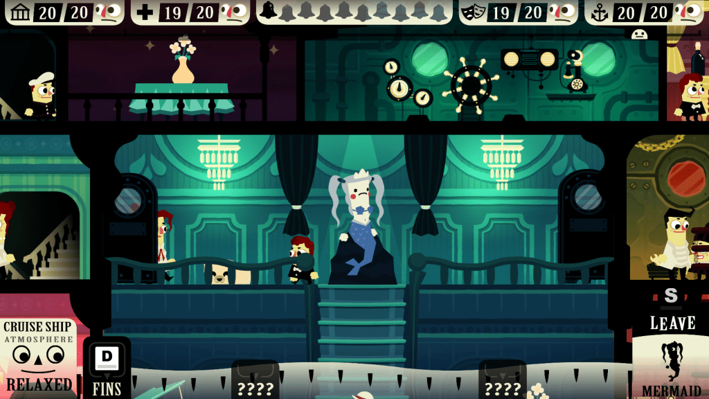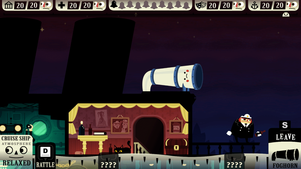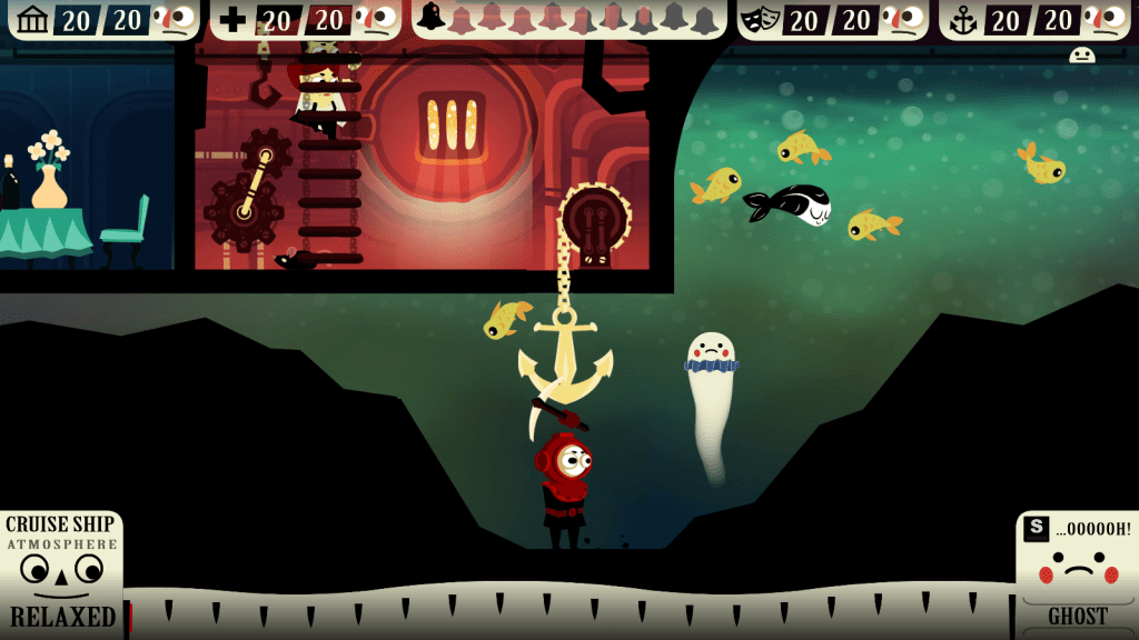 The cruise ship is the best (and seemingly only) place to go near the water, and it is overseen by the illustrious Captain (name not provided). Unfortunately though, the vessel isn’t entirely ship shape, with rats in its hull and numerous leaks that can be caused by outside forces. Perhaps the Captain ought to find a way to port? but he definitely won’t find it at the bottom of his bottle. Perhaps someone ought to blast him out of his stupor, if only he would stop hanging out so close to the edge.