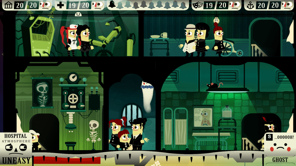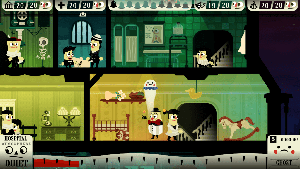 We take control of a ghost, who looks suspiciously like the same ghost from the first game, but this time around he’s moved his base of operations to an abandoned clocktower. This is the eponymous Terror Town, consisting of four locations: A hospital, a restaurant ship, a theater and museum. Since the town never sleeps, neither does the ghost who wants to just be left alone. So your mission is made very clear as evidenced by the photo below: