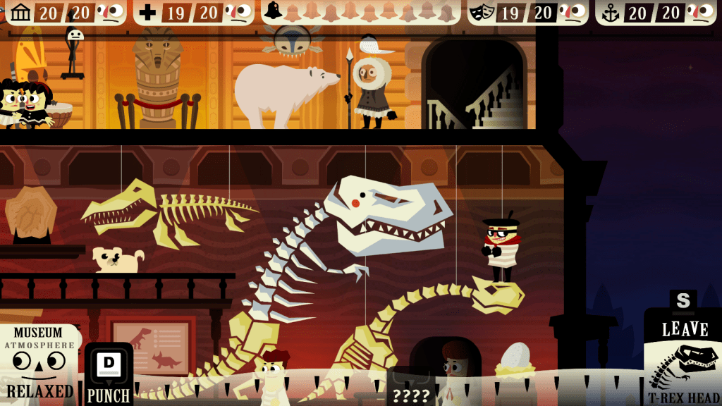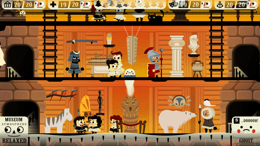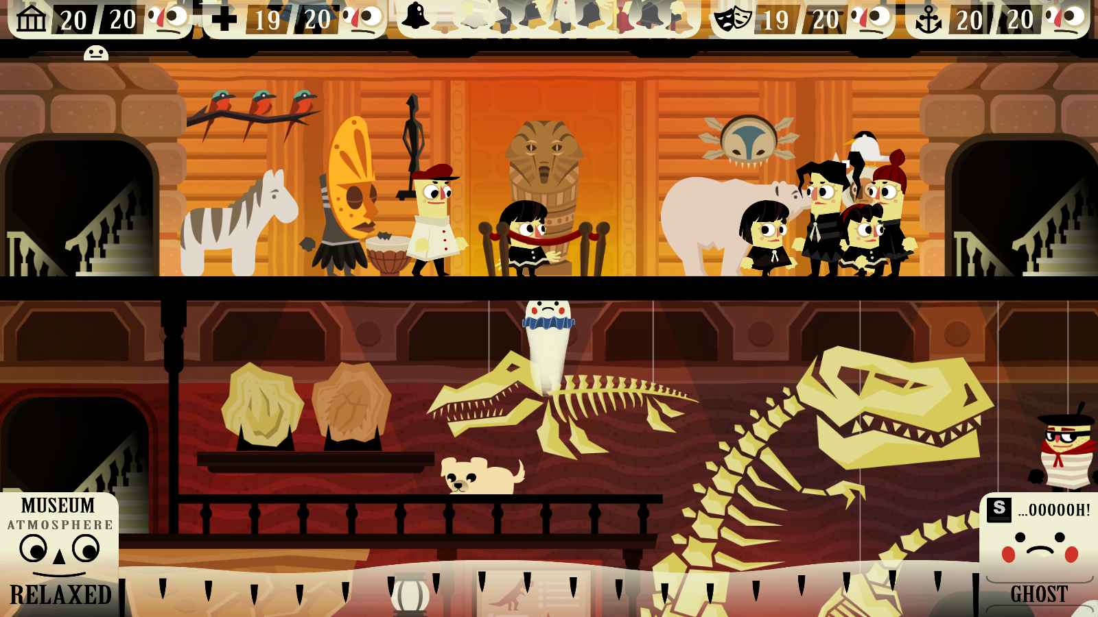 Possessing the largest amount of objects to possess to date, the museum has to be the highlight of the game. You’re not starved for choice when it comes to objects, as nearly everything can be possessed and used against the patrons. If you’re into stationary objects, there are quite a few options like the barometer in the attack or the polar bear on the second floor. Alternatively, there are quite a few movable objects like the mannequins, which can be moved around to scare anyone in the room rather quickly. But what sells it for me is the attention to detail that they get for some things and lack with others. The birds on the second floor can be possessed and they fly in sequence, like actual birds. But when it comes to the dinosaur hall, the mosasaur fossil will just be labeled as a dinosaur, which any dino nerd will tell you is not true (It’s a marine reptile, there’s a difference). Usually I’m very critical about that but given the stupidity of some of these people and the time period it is set in, I’ll let it slide.